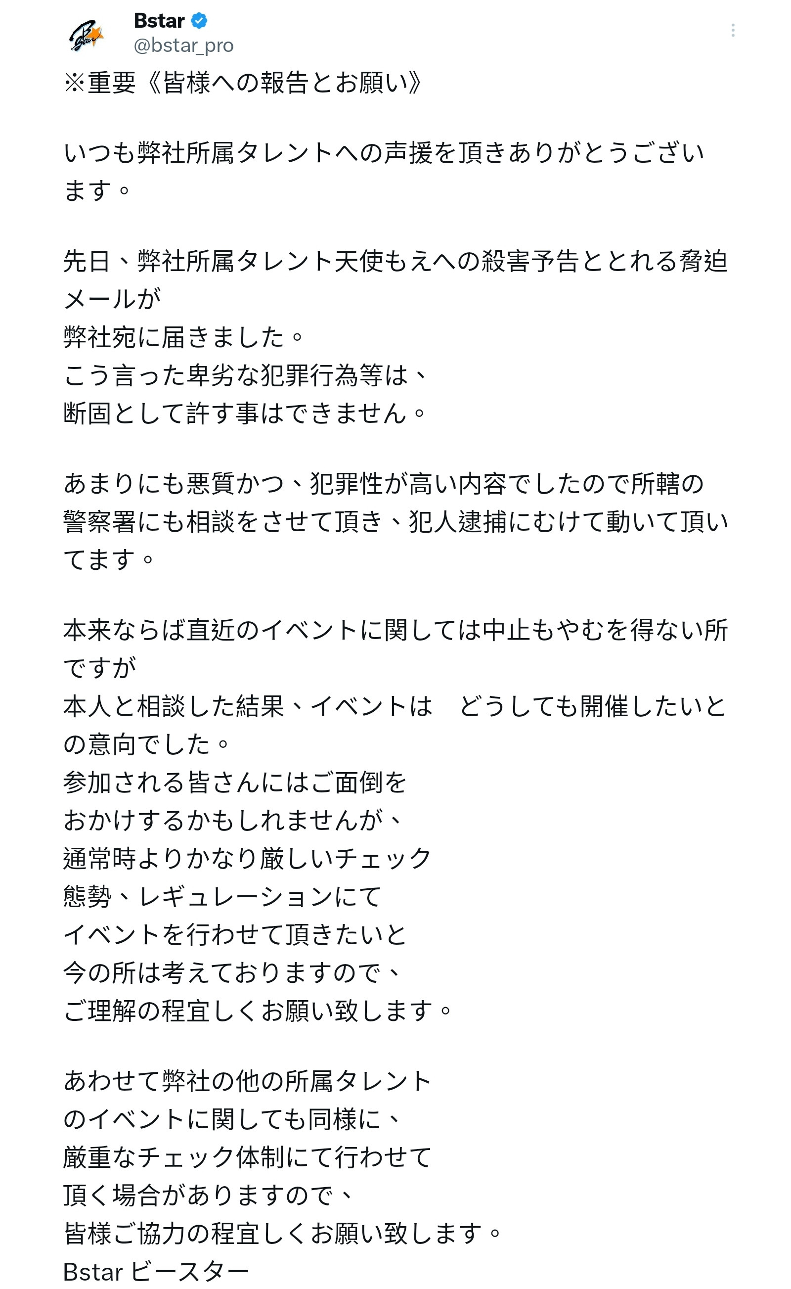 除了立刻报警,希望赶快把这王八抓到之外,事务所也在研究是不是要把活动取消比较好;不过天使本人并不想活动因此取消,所以活动还是会照办,只是安检会比平常更加严格⋯