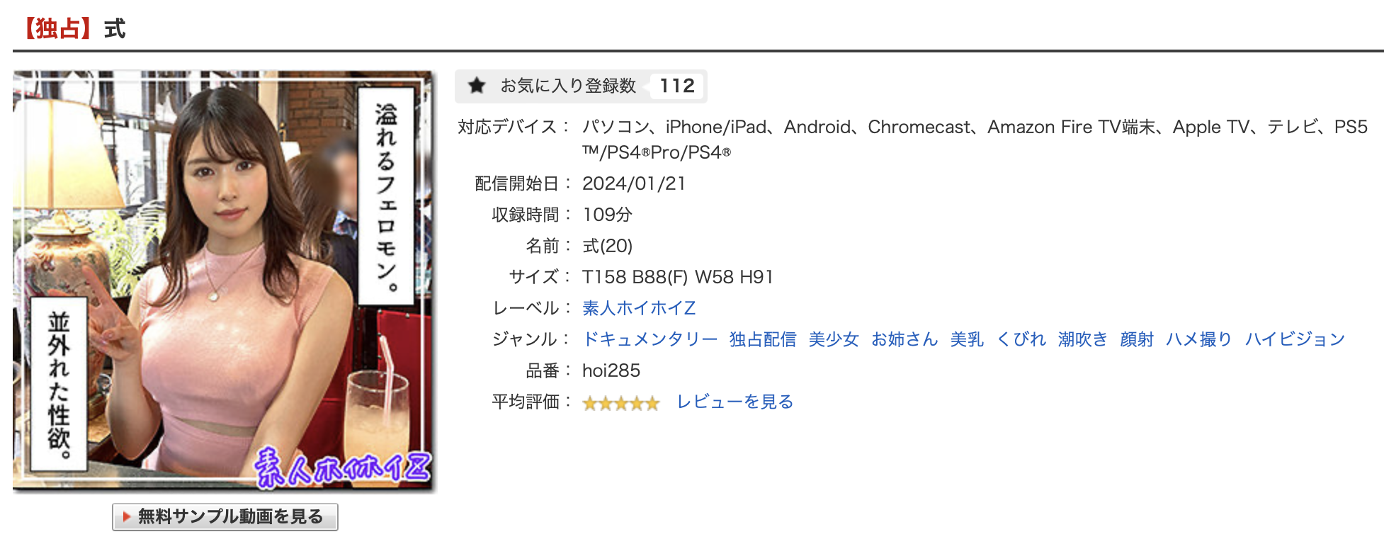 而且不只这支番号HOI-285的作品,在蚊香社体系列的MGStage也可以找到她的身影,番号SIRO-5209的片子『【缔めつけ最高の名器】「気持ち良くなりたくて…」と応募してきてくれたプリ尻女子大生!エロさMAXのえっちなカラダを堪能!徐々にスイッチが入ってくる姿は圧巻!【初撮り】ネットでAV応募→AV体験撮影2096』、那位最强名器的大学生也是由白都四季演出ー到了这里就没什么好说了,她真的不再是任何一家片商的专属女优,而是可以自由游走于各片商发片的企划女优惹⋯